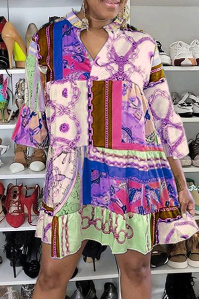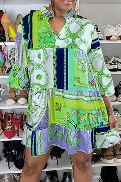 - Product Name: Casual Print Patchwork Buckle Turndown Collar A Line Dresses
