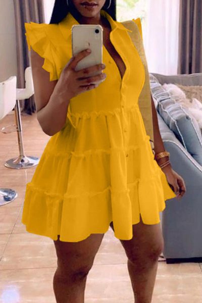 - Product Name: Casual Solid Split Joint Buckle Flounce Turndown Collar A Line Dresses