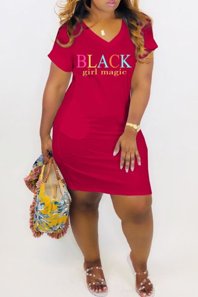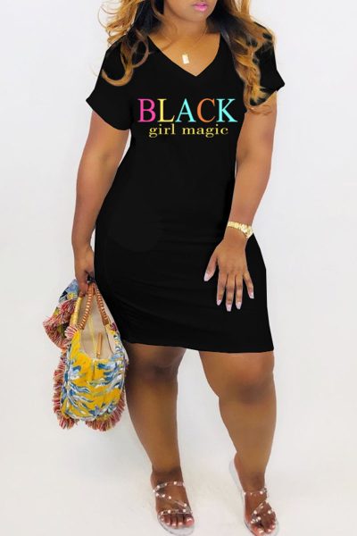 - Product Name: Fashion Casual Letter Print Basic V Neck Short Sleeve Dress