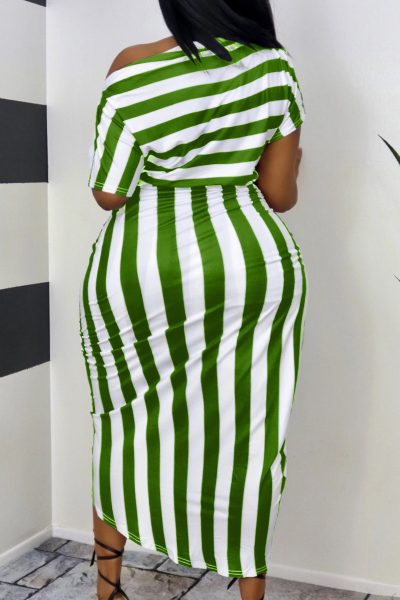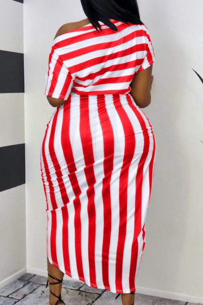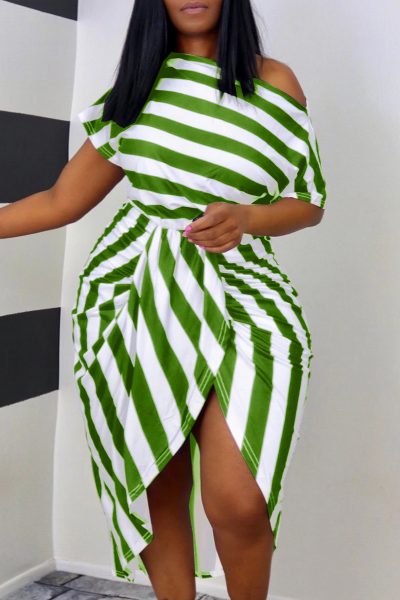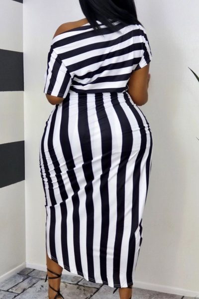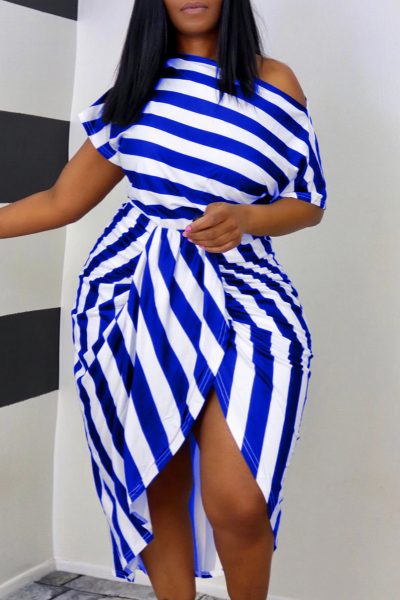 - Product Name: Fashion Casual Striped Print Asymmetrical Oblique Collar Short Sleeve Dress Plus Size Dresses