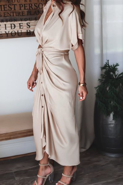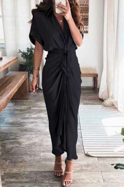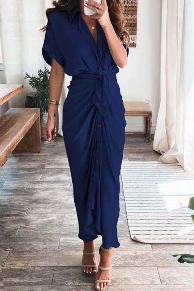 Material Polyester Style Fashion,Street Pattern Type Solid Element Patchwork Neckline Turndown Collar Silhouette A Line Sleeve Length Short Sleeve Dresses Length Ankle Length inchcmSize(in) Bust Waist Dresses Length S 39.4 39.4 49.2 M 40.9 40.9 49.6 L 42.5 42.5 50 XL 44.1 44.1 50.4 Size(cm) Bust Waist Dresses Length S 100 100 125 M 104 104 126 L 108 108 127 XL 112 112 128