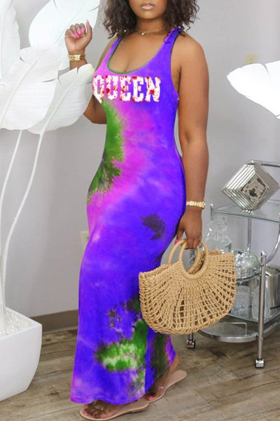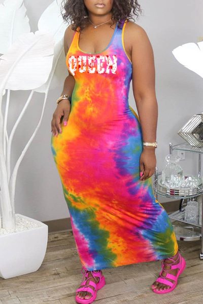 Sexy Casual Letter Print Tie-dye U Neck Vest Dress