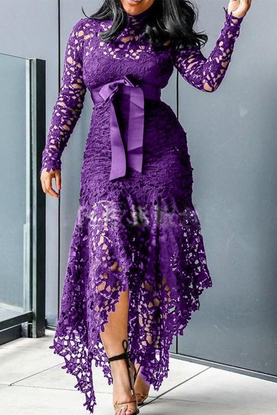 Sexy Solid Lace O Neck Irregular Dress Dresses
