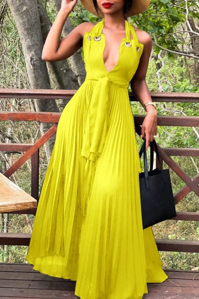 - Product Name: Sexy Solid Split Joint Fold Halter A Line Dresses